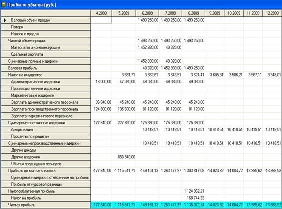 Сформированный отчет, в программе Project Expert, показывает все плюсы и минусы созданного проекта ООО «Рио». Анализируя статьи отчета о прибылях и убытках, видно, что данное предприятие развивается и во втором полугодии получает свою первую прибыль (1263477,97).