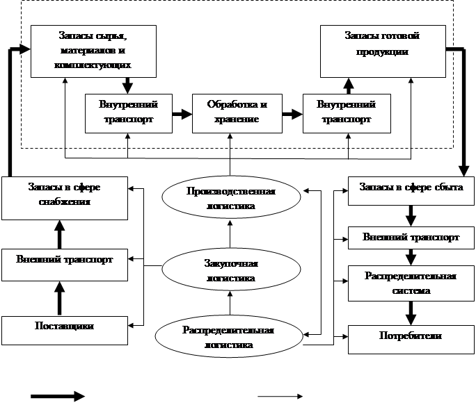 Материальный поток – это готовые изделия, полуфабрикаты и сырьё, находящиеся в процессе движения от производителя к потребителю в определённом временном интервале и вовлечённые в различные логистические операции, осуществляющиеся элементами логистической цепи. Логистическая цепь – это линейно упорядоченное множество отдельных элементов логистической системы (физических и юридических лиц, производителей, дистребьюторов, дилеров, складов, транспорта и т.д.).