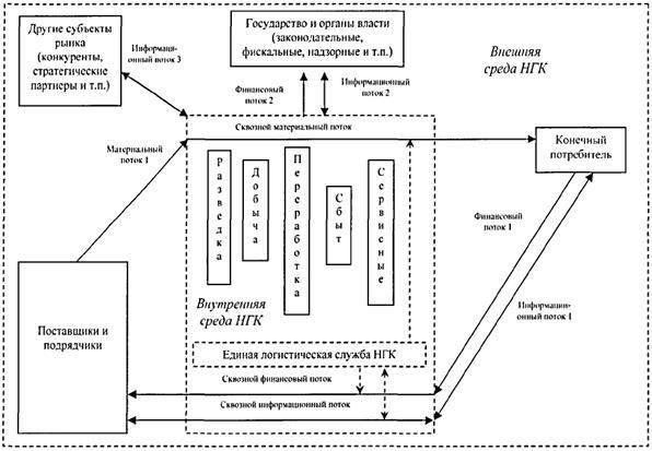 Под потоковыми процессами предприятий нефтегазового комплекса понимается движение материальных, финансовых и информационных нотоков в условиях оптимизации деятельности предприятий нефтегазодобывающей отрасли. Схема движения основных потоков в нефтегазовой корпорации показапа на рис. 3.