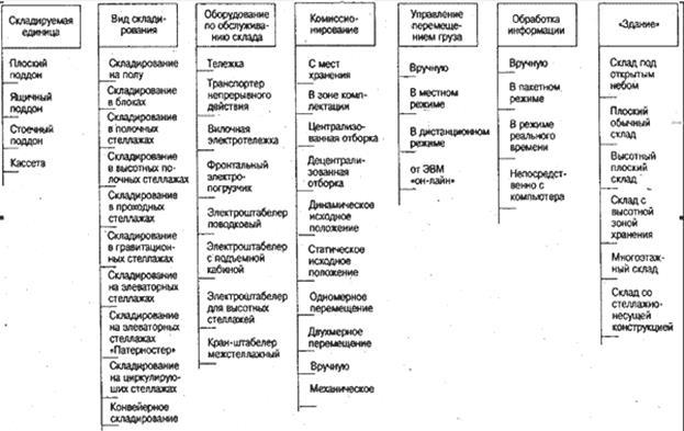 Разработка СС основывается на выборе рациональной системы из всех технически возможных систем для решения поставленной задачи методом количественной и качественной оценки. Этот процесс выбора и оптимизации предполагает выявление связанных между собой факторов, систематизированных в несколько основных подсистем. Итак, система складирования включает следующие складские подсистемы: складируемая грузовая единица, вид складирования, оборудование по обслуживанию склада, система комплектации, управление перемещением груза, обработка информации, «здание» (конструктивные особенности зданий и сооружений.