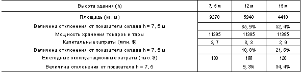 Общие затраты на высотный склад меньше в несколько раз, чем затраты на склад с тем же объемом, но с более низкой высотой, что видно из сравнения капитальных и эксплуатационных затрат, приведенных в табл. 1.