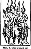 На початковому етапі східнослов'янської цивілізації воєнна організація була родоплемінною. Саме рід дбав про зброю та військове спорядження, забезпечував охорону осель, городищ від ворогів. Усі важливі воєнні справи (ведення війни, укладення миру) вирішувалися на вічі. Не було ніяких рангів чи ступенів. Керував воями (мал. 1) в бою воєвода або князь. Озброєння було різноманітним: списи різних видів (по два-три у кожного), сокира, лук (він був відомий слов'янам здавна, проте не мав такого поширення, як, наприклад, у степових народів). Пізніше слов'яни запозичили у готів меч. У ближньому бою використовували короткий ніж. Тіло захищали щитом. Кидали каміння за допомогою пращі. До бою військо йшло пішим ходом.