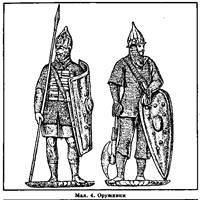 шолом, щит, меч, спис, сокиру (мал. 4). Стрільці, або ж лучники, були озброєні тільки луками та стрілами. До кінця XI ст. українське військо було пішим. Головною ударною силою виступала важкоозброєна піхота (у панцирах, із щитами, списами). Кінноту вперше використали Олег та Ігор у X ст. у походах на Візантію, на греків. Кіннота підрозділялася на важку (воїни у панцирах, шоломах, зі списами і щитами) і легку (стрільці з