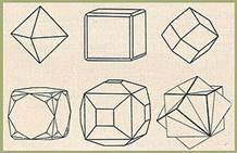 Рис 2. Формы кристаллов флюорита и двойник прорастания кубических кристаллов по плоскости (111).