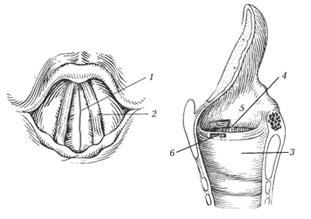 4 – желудочек гортани; 5 – четырехугольная мембрана; 6 – голосовая связка.