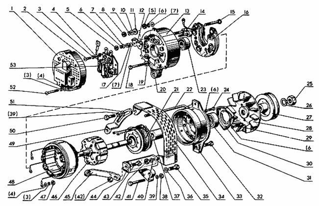 16Выпрямитель;17Втулкраспорная;18Болт;19Изолятор фазный; 20 Втулка разрезная; 21 Катушка возбуждения; 22 Болт стяжной; 23 Шарикоподшипник 6-180502 К1С9 ТУ 4533-76; 24 Винт М5-6gх14,5 ОСТ 37001.127-81; 25 Гайка М16х1,5-6Н.5А.019 ГОСТ 5929-70; 26 Шайба 16Л 65Г 016 ГОСТ 6402-70; 27 Шкив одноручьевой; 28 Вентилятор; 29 Винт М5-6gх26 ОСТ 37001.127-81; 30 Крышка подшипника; 31 Шарикоподшипник; 32 Болт М10-6gх30.88.35.019 ГОСТ 7796-70; 33 Крышка передняя; 34 Щиток; 35 Болт М12-6gх35.88.35.019 ГОСТ 7796-70; 36 Шайба; 37 Втулка ротора; 38 Гайка М8-6Н.6.019 ГОСТ 6915-70; 39 Шайба 8 65Г 06 ГОСТ 6402-70; 40 Шайба 10 65Г 06 ГОСТ 6402-70; 41 Болт М8-6gх100.88.35.019 ГОСТ 7795-70; 42 Гайка М10-6Н.6.019 ГОСТ 5915-70; 43 Болт М10-6gх55.88.35.019; 44 Кронштейн генератора; 45 Растяжка ;46 Ротор; 47 Гайка М4-6Н ОСТ 37001.124-55;48 Статор; 49 Планка; 50 Болт М8-6gх25.88.35.019 ГОСТ 7796-70; 51 Шайба упорная; 52 Винт М8х28; 53 Регулирующее устройство