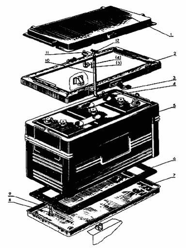 1 Крышка; 2 Рамка; 3 Шплинт 2х12; 4 Шайба 6.01.019; 5 Батарея ЗСТ-215ЭР; 6 Прокладка; 7 Основание; 8 Шайба; 9 Болт М8-6gх16; 10 Шпилька; 11 Шпилька; 12 Гайка М6 .