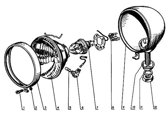 фары служат для освещения участка пути, находящегося впереди и сзади движущейся машины. Фара состоит из корпуса, отражателя, стекла. Ободка, токовыводящих проводов и патрона с лампой. Стекло, отражатель и лампа образуют оптический элемент, который соединен с ободком пружинными защелками. Ободок соединен с корпусом соединительным винтом. Оптический элемент прикреплен к корпусу фары пружинами и регулировочными винтами.