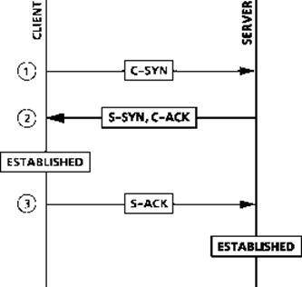 Вспомним, что установка TCP-соединения происходит в три стадии (3-way handshake): клиент выбирает и передает серверу sequence number (назовем его C-SYN), в ответ на это сервер высылает клиенту пакет данных, содержащий подтверждение (C-ACK) и собственный sequence number сервера (S-SYN). Теперь уже клиент должен выслать подтверждение (S-ACK). Схематично это