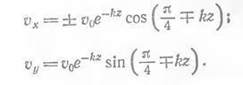 В 1905 году шведский ученый В. Экман создал теорию ветрового течения в открытом глубоком океане. Как удивительно поворачивается течение в глубине (рис.1.13) под действием силы Кориолиса" Вот формулы, описывающие эту спираль Экмана. Если ветер направлен по оси у, то вектор скорости течения (Vx
