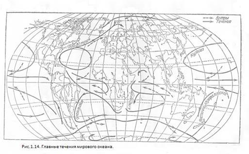 Это тоже проявление кориолисовых сил, направляющих полный поток жидкости, как и в спирали Экмана, перпендикулярно направлению ветра. Когда пассатные течения подходят к шельфу - подводному краю континентов - им приходится и у поверхности поворачивать от экватора. Так начинаются мощные течения средних широт: Гольфстрим (англ.”течение залива”) и Бразильское течения в Атлантике, Куросио и Восточно-Австралийское течения Тихого океана, Мадагаскарское течение Индийского океана. Основная движущая сила этих течений уже не ветер, а напор воды у континентов. Уровень воды океана в Атлантике в Мексиканском заливе на 60 см выше, чем у Африки, а в Тихом океане разница уровней между западным и восточным его берегами достигает 70 см. Создается такой нагон пассатными ветрами. Но структура течений средних широт уже не ветровая: они прослеживаются в океане до глубины в полтора-два километра и только еще глубже можно обнаружить слабое противотечение.