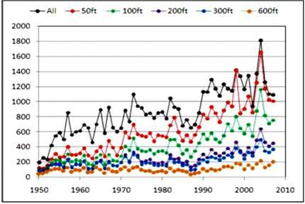 Аналогичная ситуация увеличения числа торнадо наблюдается и для территории США. На рисунке показаны графики числа торнадо с 1950 по 2007 годы для разных классов торнадо. Графики, также отражают стабильное увеличение числа торнадо всех классов в США, особенно, в последние два десятилетия.