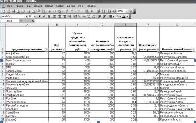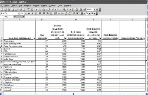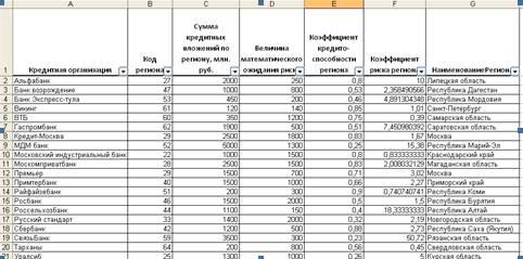 · Введем формулу в ячейку F1 коэффициент риска региона = Сумма кредитных вложений по региону / (Величина математического ожидания риска*Коэффициент кредитоспособности региона);