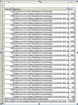 Задание №8. Создайте сводную таблицу, состоящую из кредитных организаций, кода региона, кредитных вложений.