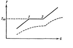Если веществу, первоначально находившемуся в кристаллическом состоянии, сообщать каждую секунду одно и то же количество тепла, то изменение температуры тела со временем будет таким как показано на рис. 3.