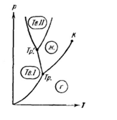 Для вещества с несколькими кристаллическими модификациями диаграмма состояния имеет более сложный характер. На рисунке 7 изображена диаграмма для случая, когда число различных кристаллических модификаций равно двум. В этом случае имеются две тройные точки. В точке Tp в равновесии находятся жидкость, газ и первая кристаллическая модификация вещества, в точке Tp’ находятся в равновесии жидкость и обе кристаллические модификации.