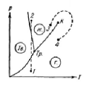 Можно отметить еще одну особенность диаграммы состояния. Кривая испарения заканчивается в критической точке К. Поэтому возможен переход из области жидких состояний в область газообразных состояний, совершаемый в обход критической точки, без пересечения кривой испарения (переход 3-4 на рис.8). В этом случае переход из жидкого состояния в газообразное (и обратно) совершается непрерывно, через последовательность однофазных состояний.
