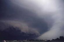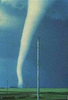 Смерч (синонимы – торнадо, тромб, мезо-ураган) – это очень сильный вращающийся вихрь с размерами по горизонтали менее 50 км и по вертикали менее 10 км, обладающий ураганными скоростями ветра более 33 м/с. Энергия типичного смерча радиусом 1 км и средней скоростью 70 м/с, по оценкам С.А.Арсеньева, А.Ю.Губаря и В.Н.Николаевского, равна энергии эталонной атомной бомбы в 20 килотонн тротила, подобной первой атомной бомбе, взорванной США во время испытаний «Тринити» в Нью-Мексико 16 июля 1945. Форма смерчей может быть многообразной – колонна, конус, бокал, бочка, бичеподобная веревка, песочные часы, рога «дьявола» и т.п., но чаще всего смерчи имеют форму вращающегося хобота, трубы или воронки, свисающей из материнского облака (отсюда и их названия: tromb- по французски труба и tornado – по испански вращающийся). Ниже на фотографиях показаны три смерча в США: в форме хобота, колонны и столба в момент касания ими поверхности земли, покрытой травой (вторичное облако в виде каскада пыли вблизи поверхности земли не образуется). Вращение в смерчах происходит против часовой стрелки, как и в циклонах северного полушария Земли.