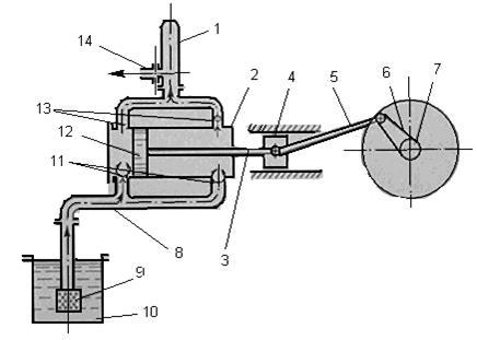 1- компенсатор; 2- цилиндр; 3-шток; 4-крейцкопф; 5-шатун; 6- кривошип; 7-вал; 8-всасывающий трубопровод; 9-фильтр; 10-приемный чан; 11-всасывающие клапаны; 12-поршень; 13-нагнетательные клапаны; 14-напорная линия
