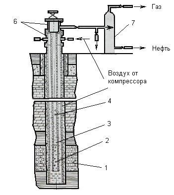 1-опробуемый пласт; 2-фильтр; 3-НКТ; 4-отверстия для аэрации жидкости; 5-эксплуатационная колонна; 6-устьевая арматура; 7-трап для разделения жидкости и газа