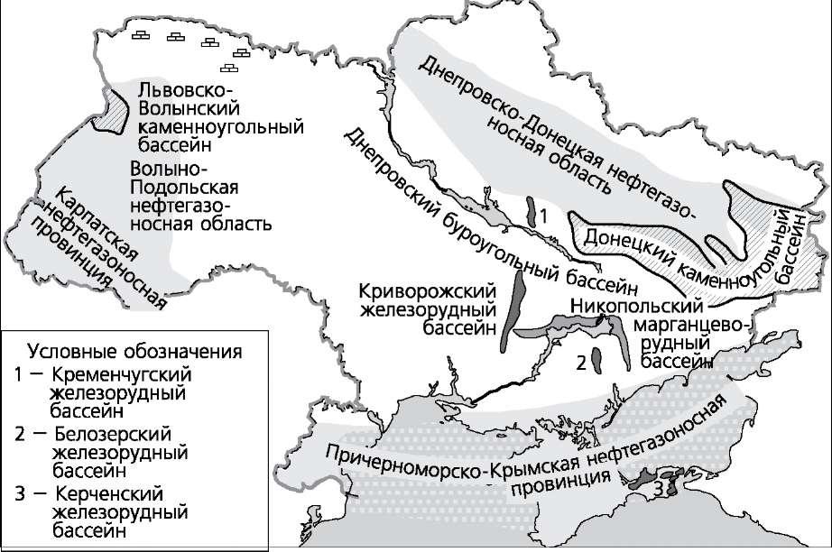 Карпатская складчатая система имеет наиболее сложное строение. Внешняя зона образована интенсивно дислоцированными породами мела — палеогена: обломочные толщи, чередование песчаников и аргилитов. Вну- тренняя зона составлена преимущественно известняковыми породами мезозойского возраста. Предкарпатский прогиб, отделяющий Карпаты от Восточно-Европейской платформы, образован в неогене обломочными и со- леносными толщами. Минерально-сырьевые ресурсы Минерально-сырьевые ресурсы — совокупность разведанных запасов полезных ископаемых, которые используются или могут использоваться в хозяйственной деятельности. INCLUDEPICTURE "media/image9.png" \* MERGEFORMAT  На территории Украины объединяются разные по возрасту и условиям об- разования тектонические структуры, поэтому в ее пределах сформировались разные горные породы и соответственно — полезные ископаемые. Среди топливных полезных ископаемых наиболее ценными являются ме- сторождения нефти и газа, сосредоточенные в Днепровско-Донецкой нефте- газоносной области, Карпатской и Причерноморско-Крымской нефтегазонос- ных провинциях. В Украине открыто свыше 150 новых месторождений нефти и газа. Наиболее крупные в Прикарпатье месторождения нефти — Долинское, Бориславское, газа — Дашавское, Калушское. В Днепровско-Донецкой обла- сти выделяются месторождения газа — Западнохрестищенское, Шебелинское, Ефремовское (Харьковская обл.), нефти — Прилукское (Черниговская обл.), Радченковское, Сагайдакское (Полтавская обл.). Перспективным считается Причерноморский бассейн. Здесь в прибрежных частях Черного моря вы- явлены залежи газа на глубине 700—750 м. Большое значение имеет уголь, который добывают в Донецком, Львовско-Волынском каменноугольных и Дне- провском буроугольном бассейнах. В Карпатах добывают горючие сланцы на Подолье, в Кировоградской области. Торфяные месторождения сосредоточены на Полесской низменности. Украина обладает огромными запасами железных и марганцевых руд. Есть запасы титановых и ртутных руд; не до конца разведаны запасы медных, хромовых, алюминиевых руд и золота. Некоторые руды цветных металлов в Украину импортируются. География размещения месторождений рудных полезных ископаемых в Украине представлена следующим образом: железные руды — Криворож- 16
