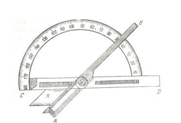 прикладывается так, чтобы между его гранями, линейкой и транспортиром не было просвета; величина угла фиксируется непосредственно на транспортире.