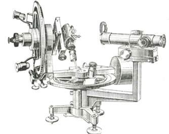 Е. С. Федоровым был изобретен двукружный гониометр (рис. 3), в котором имеются два круга — горизонтальный и вертикальный, что дает возможность измерять углы между любыми гранями кристалла, не меняя его положения. На этом приборе можно быстро замерить положение граней в сферических координатах даже для самых мелких кристаллов.