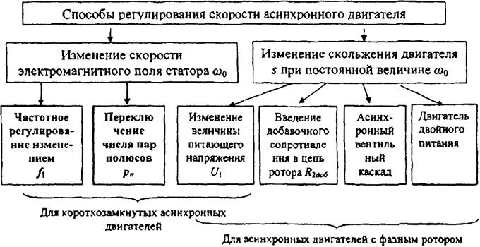 Регулирование скольжения двигателя при постоянной скорости вращения поля статора для короткозамкнутых асинхронных двигателей возможно путем изменения величины напряжения статора при постоянной частоте этого напряжения. Для асинхронных двигателей с фазным ротором, кроме того, возможны еще два способа: введение в цепь ротора добавочных сопротивлений (реостатное регулирование) и введение в цепь ротора добавочной регулируемой э.д.с. посредством преобразователей частоты, включаемых в цепь ротора (асинхронный вентильный каскад и двигатель двойного питания).