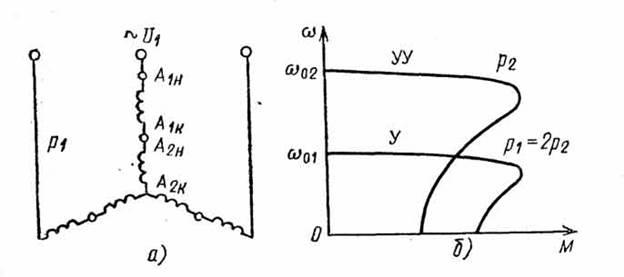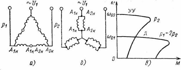 Наряду с такими АД, получившими название многообмоточных, широкое распространение получил другой тип многоскоростных АД, у которых изменение числа пар полюсов вращающегося магнитного поля достигается за счет изменения схемы соединения статорной обмотки АД. Для этого каждая фаза статора разделена на несколько одинаковых частей (чаще всего на две части) и имеет от них соответствующее число выводов.