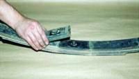 Смазываем графитной смазкой и сжимаем листы рессоры в тисках, совместив отверстия стержнем диаметром 10 мм. Собираем и устанавливаем рессору в обратной последовательности. При этом сначала присоединяем рессору к кронштейну кузова (коротким концом вперед), а затем крепим серьгу.