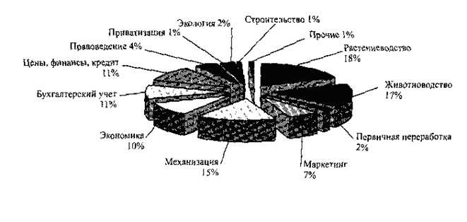 Анализ запросов, поступающих в региональные и районные информационно-консультационные центры показал, что наибольшее количество консультаций оказано по растениеводству (18%), животноводству (17 %), бухучету (11 %), ценам, финансам и кредитам (11 %), экономике (10 %) (рис.1).