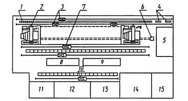 Рис. 1 - Структурная схема ГПЛ АЛП-3.2: 1 — центральный накопитель инструментальных насадок; 2 — многооперационные станки с ЧПУ; 3 — инструментальные роботы-автооператоры; 4 — агрегаты подъема и спуска инструментальных кассет; 5 — участок настройки инструмента вне станка; 6 — конвейер уборки стружки; 7 — штабе-лерАТС-2; 8 — позиция загрузки-разгрузки АТС-2; 9 — позиция многооперационного контроля; 10 — штабелер автоматизированного склада; 11 —отделение комплектации заготовок; 12 — отделение окончательной доработки деталей; 13 - отделение мойки деталей; 14 — отделение окончательного контроля деталей; 15 — помещение обслуживающего персонала