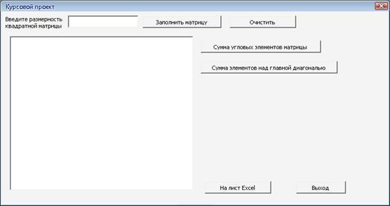 Рисунок 4 – Пользовательская форма: 1 – TextBoxInput - поле для ввода значения n, размерности матрицы; 2 – ButtonCreate - кнопка, при нажатии которой осуществляется заполнение матрицы; 3 – ButtonClear-кнопка, при нажатии которой осуществляется очистка всех полей формы; 4 – BtnTask1 - кнопка, при нажатии которой программа находит сумму угловых элементов матрицы; 5 – BtnTask2 - кнопка, при нажатии которой программа находит сумму элементов матрицы, находящихся над верхней диагональю; 6 – BtnExcel – кнопка, при нажатии которой пользовательская форма скрывается, и отображаются данные на листе Excel; 7 – Кнопка, при нажатии которой осуществляется выход из программного модуля; 8 – Поле для вывода заполненной матрицы 3. Реализация программного модуля
