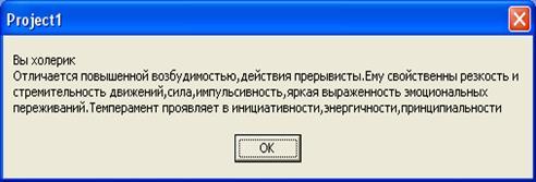Результат работы программы удовлетворяет всем требованиям, поставленным перед разработчиком данной программы. Итогом работы программы является выведенный на экран тип темперамента и подробное описание к нему.
