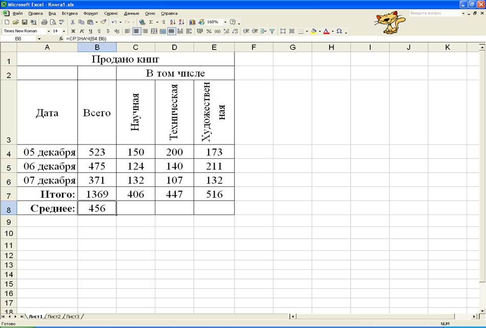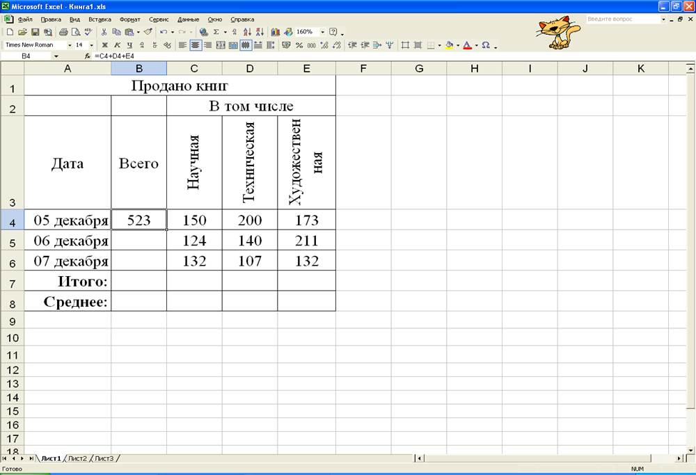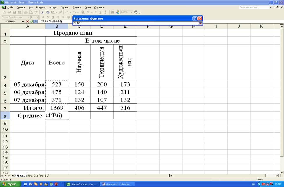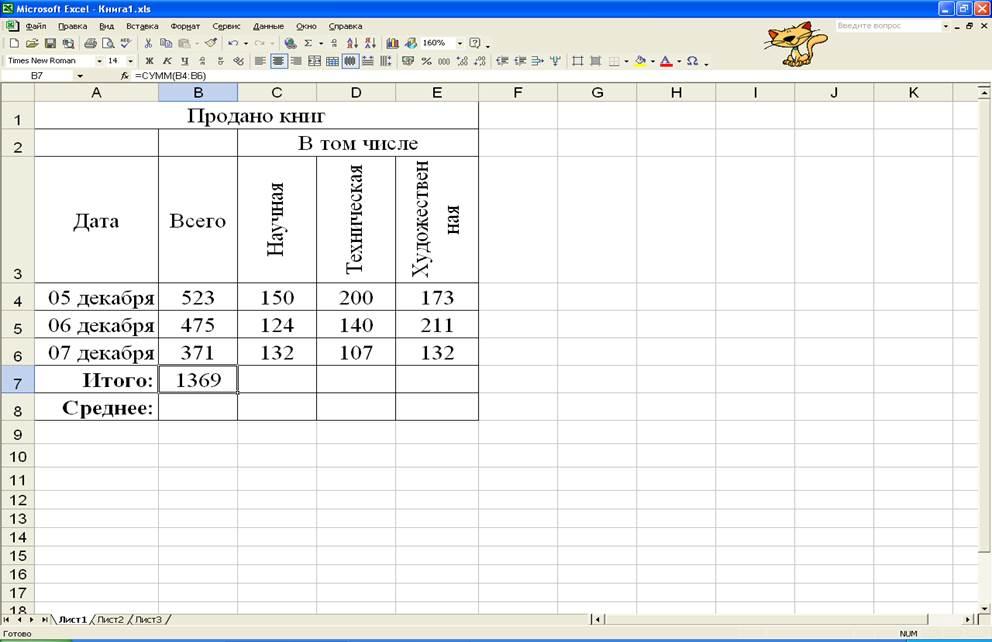рассчитать суммарные значения по столбцам, в строке Среднее