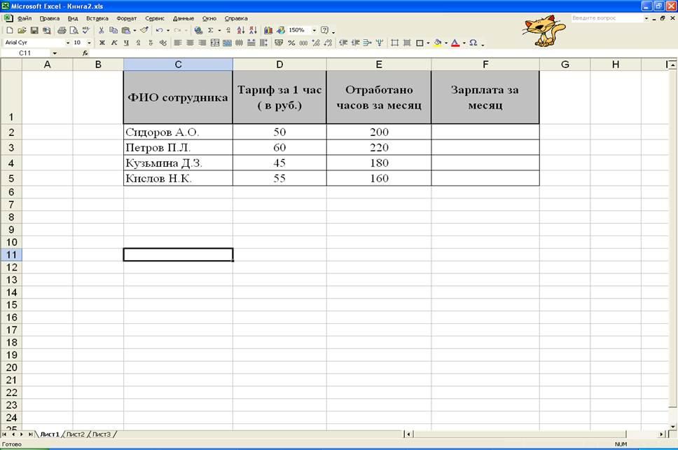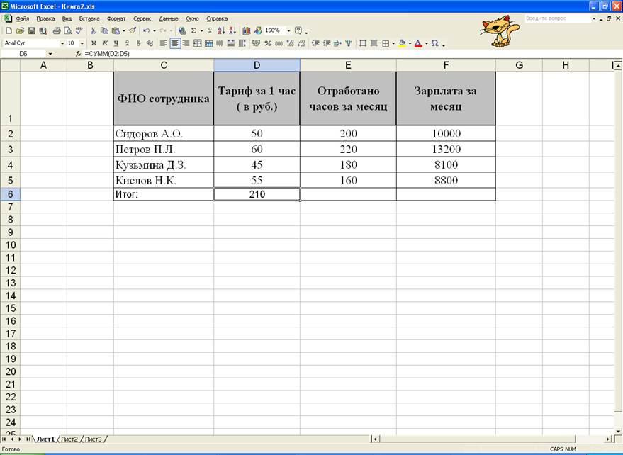 В программе Excel в ячейках С1:F5 набрать следующую таблицу, причем зарплату за месяц вычислить, используя соответствующие формулы, а затем подвести итоги по столбцам.
