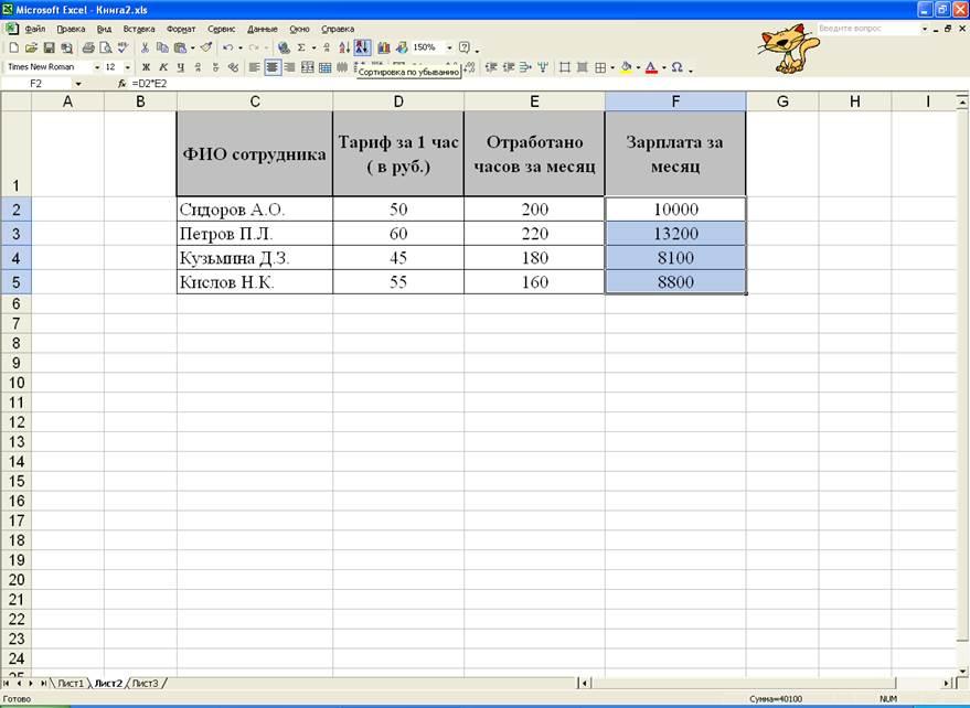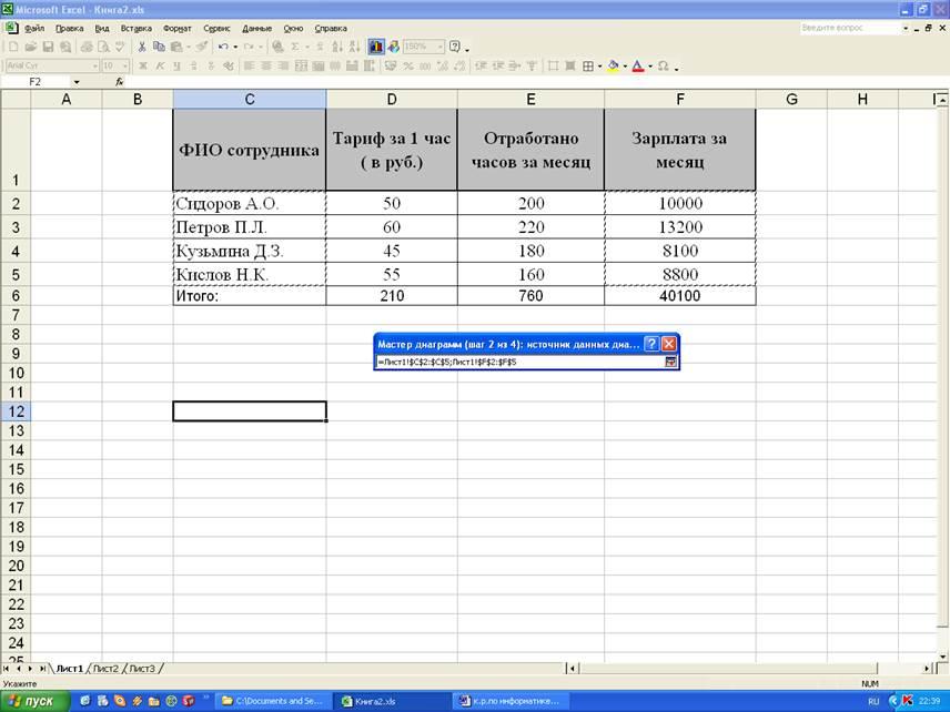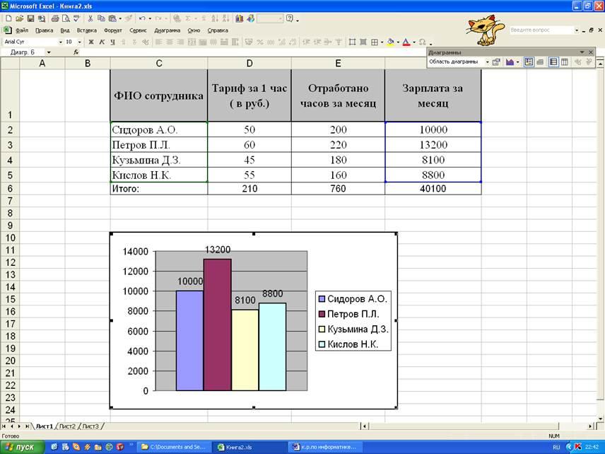 Построить диаграмму «ФИО» - «Зарплата за месяц». Скопировать таблицу на другой лист и отсортировать список по убыванию суммы зарплаты.