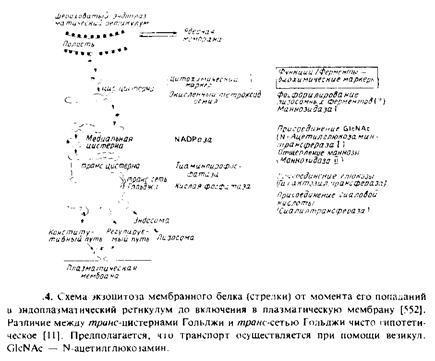 О сигналах, ответственных за локализацию интегральных мембранных белков в экэоцитозной системе, известно немного. По-видимому, за фиксацию белка Е19 аденовируса в мембране эндоплазматического ретикулума отвечает короткая последовательность на С-конце молекулы. Этот белок имеет единственный трансмембранный сегмент и цитоплазматический «хвост» из 15 остатков на С-конце. Уменьшение длины «хвоста» только на восемь аминокислотных остатков приводит к транспорту белка из эндоплазматического ретикулума. Возможно, сигнальный участок взаимодействует прямым или косвенным образом с некой цитоплазматической структурой, что обеспечивает заякоривание белка Е19 в эндоплаз-матическом ретикулуме. Исследования гликопротеина Е1 коронави-руса показали, что сигнальная последовательность, ответственная за его нахождение в аппарате Гольджи, локализована в одной из трех предполагаемых трансмембранных спиралей.