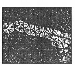 Первичные ламели имеют значительную поверхностную энергию, поэтому происходит их агрегация, приводящая к образованию монокресталов - более сложных надмолекулярных образований. При кристаллизации из расплава или концентрированного раствора полимера наиболее общего типа вторичного кристаллического образования является сферолит (рисунок 3), имеющий кольцевую или сферическую форму и достигающую гигантских размеров до 1см. В радикальных или сферических сферолитах каркас формируется из ленточных, кристаллических образований направленных от центра к периферии [6].