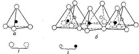 Рис. 1.1. Схематическое изображение отдельного кремнекислородного тетраэдра (а) и сетки кремнекислородных тетраэдров, расположенных по гексагональному мотиву (б): 1 – атомы кислорода; 2 – атомы кремния