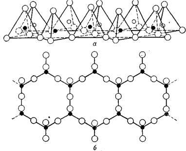Рис. 1.2. Схематическое сдвоенных цепей кремнекислородных тетраэдров, характерных для амфиболевого структурного типа глинистых минералов. а – в перспективе;
