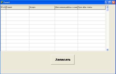 Цель работы: разработать программу, на языке Delphi, работы с клиентами, с данными: номер по порядку, наименование клиента, вид услуги, дата начала работы с клиентом и срок абонентской платы, предусмотреть ввод, редактирование и удаление данных
