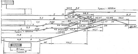 = 2200 м, что несколько меньше фактической площадки. Следовательно, такая схема может быть принята для проектирования. Фактическая длина площадки позволяет разместить станцию поперечного типа. Промежуточные станции на вновь строящихся однопутных линиях I и II категорий должны проектироваться с учетом организации скрещения удлиненных поездов. А этому требованию удовлетворяет полупродольная схема станции, которая и принимается для детального проектирования.