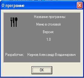 Выбрав второй пункт открывается форма, содержащая информацию о разработчике. Она имеет такой вид: