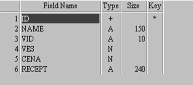 Процесс проектирования структуры базы данных подразумевает создание таблиц, которые состоят из уникальных, присущих именно этой сущности полей. Для каждого поля таблицы необходимо указать его условное название, определить тип и, если необходимо задать знаковый размер. Составление таблиц производится в одной из систем управления базой данных, например MS-Access, или в специальном приложении программы. В данном случае разработка всех таблиц производилась в приложении программы Delphi 6 DataBaseDesktop.