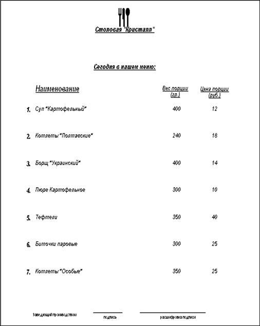 Рис. 2.17 Отчет «Меню для кухни»