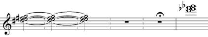 Помимо элемента С в серийную логику не вписываются квинтаккорды pizzicato. Любопытно, что звуки вступления голосов тоже образуют квинтаккорд: es2-as1-b2-des1. Это свидетельствует о том, что гармония эта является для всего «западного» раздела дополнительным конструктивным элементом (ДКЭ).