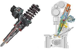 Насос-форсунка оснащен сливным каналом с быстродействующим электрогидравлическим клапаном. Комбинация — плунжерный насос, закрытая гидромеханическая форсунка, электроуправляемый от электронной автоматики сливной канал — дает возможность реализовать так называемый "послойный впрыск бензина" непосредственно в камеру сгорания ДВС. Это обеспечивает значительную экономию топлива за счет работы двигателя на очень бедных ТВ-смесях (а = 2,0), а также повышает ряд его эксплуатационных показателей. При послойном впрыске цикловая подача бензина непрерывно дифференцируется по времени посредством управления давлением в рабочей полости насос-форсунки (под плунжером). Давление регулируется электроуправляемым гидроклапаном в сливном канале. Суть послойного впрыска топлива состоит в его подаче отдельными, строго дозированными порциями. Получается так: за один цикл впрыска бензин подается прямо в цилиндр не сплошной однородной струей, а несколькими частями, каждая из которых образует "свой" коэффициент избытка воздуха а. В объеме цилиндра образуется "послойный пирог" из ТВ-смеси разной концентрации. Преимущество послойного впрыска бензина состоит в том, что в первый момент воспламенения в зону центрального электрода свечи зажигания подается нормальная (стехиометрическая) ТВ-смесь с а = 1, которая легко возгорается. Далее процесс горения топлива в очень бедной ТВ-смеси (а = 2.0) поддерживается за счет "открытого огня", образовавшегося в первый момент воспламенения. Однако система впрыска бензина с насос-форсунками обладает двумя существенными недостатками: она содержит дорогостоящие и очень сложные механические устройства, а также способствует появлению значительных количеств оксидов азота (N0X) в выхлопных отработавших газах двигателя, бороться с которыми крайне сложно. Тем не менее система выпускается фирмой TOYOTA для двигателей TD4 легковых автомобилей.