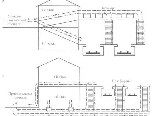 На крупных пассажирских станциях, когда привокзальная площадь располагается выше уровня перронных путей (рис а), для удобства пассажиров проектируются вокзалы с конкорсами над приемо-отправочными путями. В некоторых вокзалах помещение конкорса уширяется для размещения в нем распределительного зала (Челябинск) или зала ожидания (Самара). В ряде случаев привокзальная площадь размещается ниже уровня путей (рис в).