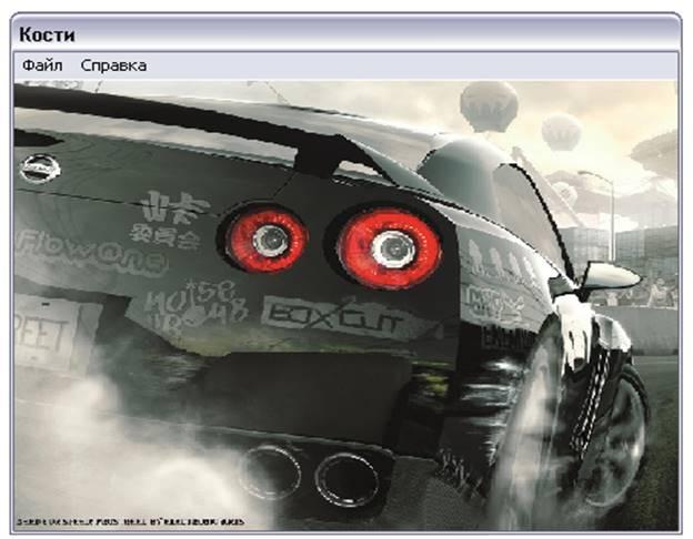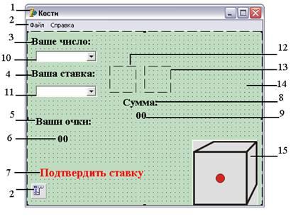 Условие задачи игры «Кости» указывает на необходимость называть любое число в диапазоне от 2 до 12. Программа с помощью датчика случайных чисел дважды выбирает числа от 1 до 6. В соответствии с рисунком 1 представлено главное окно программы.